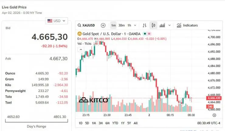 • Giá vàng giao ngay giảm 1,3%, xuống còn 4.694,48 USD/ounce